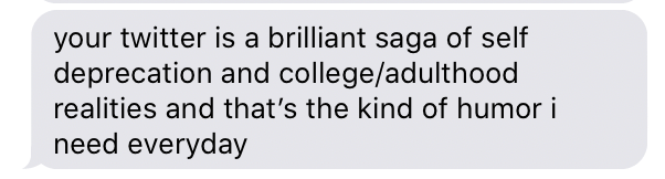 If you follow me on Twitter, then you’re already aware of the fact that my brand is me making the best of a series of unfortunate events (Um, Are You Wearing Pants? or Songs That Make Ya Ass Shake). People really seem to enjoy me making an ass of myself? Majority of my content revolves around being a struggling college student who spends half her time in the library and the other at the bars or going on failed dates. Then, when I’m feeling spontaneous, I will throw in a Montana tweet to mix it up. WAIT- did I mention I love food? Because that’s also pretty important.